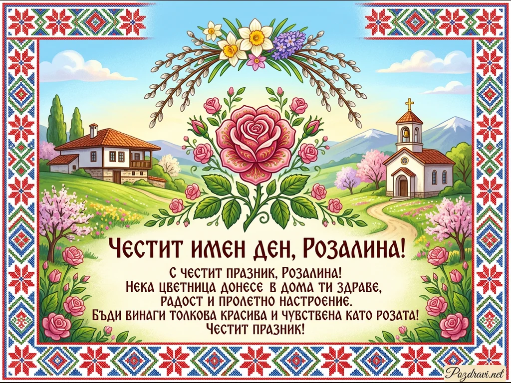 Тази празнична картичка изобразява живописна пролетна сцена, рамкирана от традиционна българска шевица. В центъра е разцъфнала розова роза, обградена от по-малки пъпки, а над нея висят върбови клонки, нарциси и зюмбюли. На заден план се виждат зелени хълмове с цъфнали дръвчета, традиционна къща отляво и малка бяла църква отдясно, на фона на планини и синьо небе. Картичката съдържа надпис 'ЧЕСТИТ ИМЕН ДЕН, РОЗАЛИНА!' и пожелание за здраве, радост и пролетно настроение.