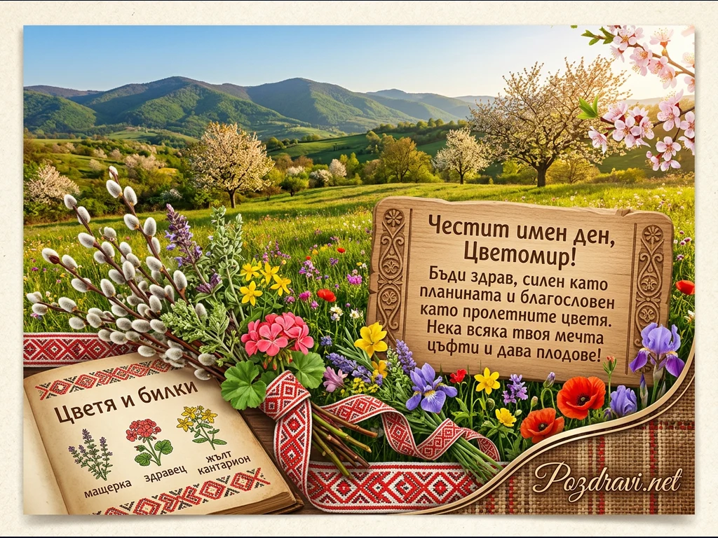 Картичката изобразява живописен пролетен пейзаж с тучни зелени хълмове и цъфтящи дървета под ясно синьо небе. В преден план са аранжирани букет от върбови клонки и разнообразни полски цветя, включително ириси, макове и здравец, превързани с лента с българска шевица. Отляво е поставена отворена книга 'Цветя и билки' с илюстрации на мащерка, здравец и жълт кантарион. Отдясно се вижда дървена табела с празнично послание 'Честит имен ден, Цветомир!', пожелаващо здраве и благословия, като цялостната композиция е изпълнена с традиционни мотиви.
