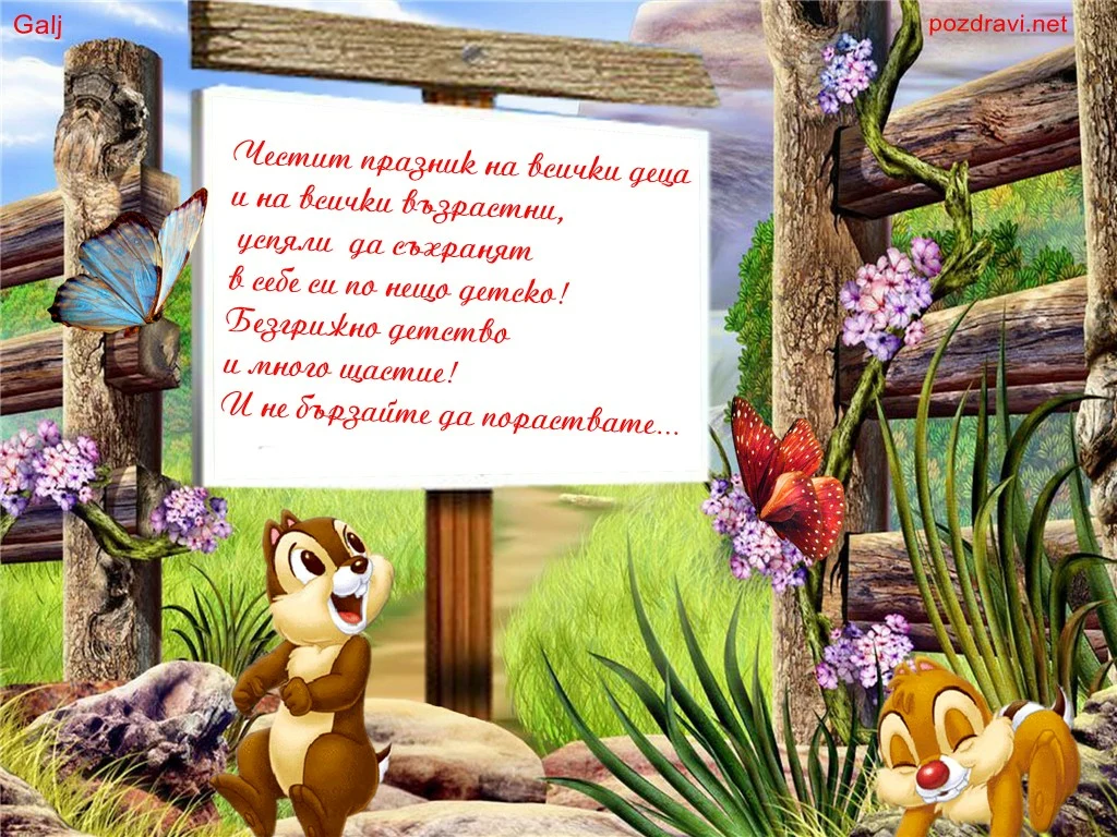 Ключови фрази: пожелание 1 юни картичка деца празник детето дете горска приказка рисунка цветя радост