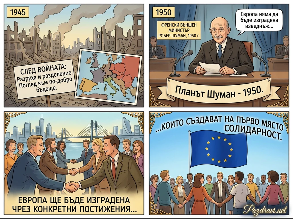Ключови фрази: История на ЕС, План Шуман, Европейска интеграция, Следвоенна Европа, Солидарност Европа