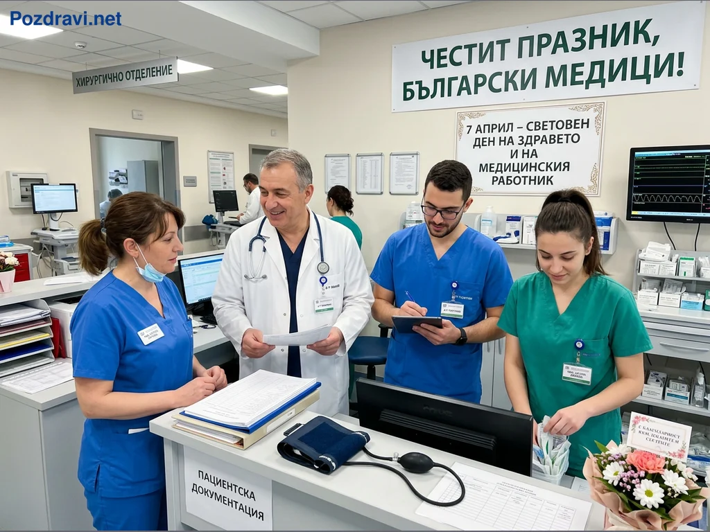 Снимката показва група медицински специалисти в болнична обстановка, вероятно в хирургично отделение. Усмихнат лекар в бяла престилка разговаря с медицинска сестра, докато други двама млади колеги обработват документация и подреждат консумативи. На заден план се виждат табели 'ХИРУРГИЧНО ОТДЕЛЕНИЕ' и празнични надписи като 'ЧЕСТИТ ПРАЗНИК, БЪЛГАРСКИ МЕДИЦИ!' и '7 АПРИЛ – СВЕТОВЕН ДЕН НА ЗДРАВЕТО И НА МЕДИЦИНСКИЯ РАБОТНИК'. На бюрото има пациентска документация, апарат за кръвно налягане и букет цветя, което създава атмосфера на работа и празник.