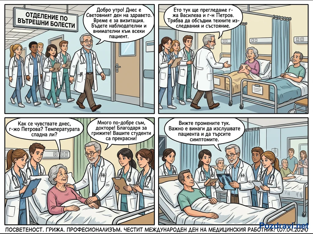 Ключови фрази: Болнична визитация, Медицински екип, Грижа за пациенти, Ден на медицинския работник, Професионализъм в медицината