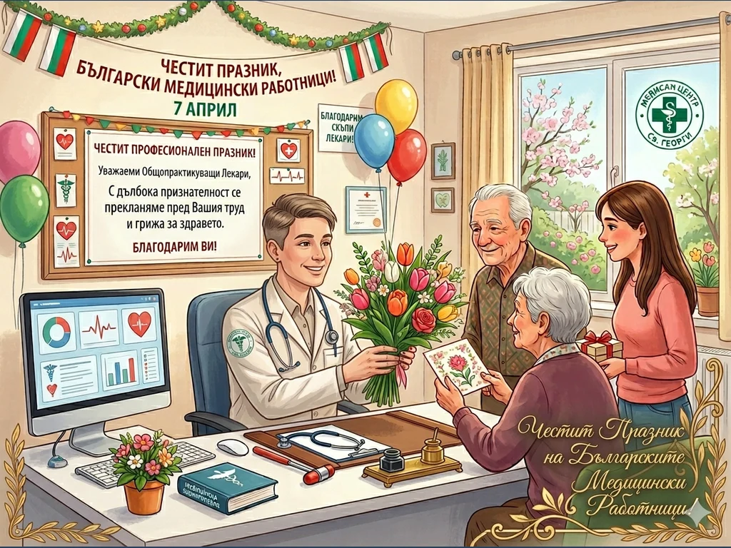 Тази красива поздравителна картичка в пейзажна ориентация (1024x768) изобразява топла и уютна сцена в лекарски кабинет по повод 7 април – Професионалния празник на медицинските работници в България.