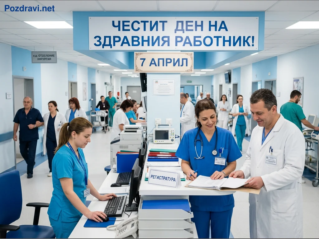 Снимката улавя оживена сцена в модерен болничен коридор или приемна зона, където медицински персонал изпълнява ежедневните си задължения. Над главите им виси голям транспарант с надпис 'ЧЕСТИТ ДЕН НА ЗДРАВНИЯ РАБОТНИК!' и датата '7 АПРИЛ', което подсказва за празник. В преден план, усмихнати медицинска сестра и лекар разглеждат документи, докато друга сестра работи на компютър на гишето на регистратурата. Множество други здравни специалисти в униформи се движат или работят на заден план, създавайки динамична и позитивна атмосфера.