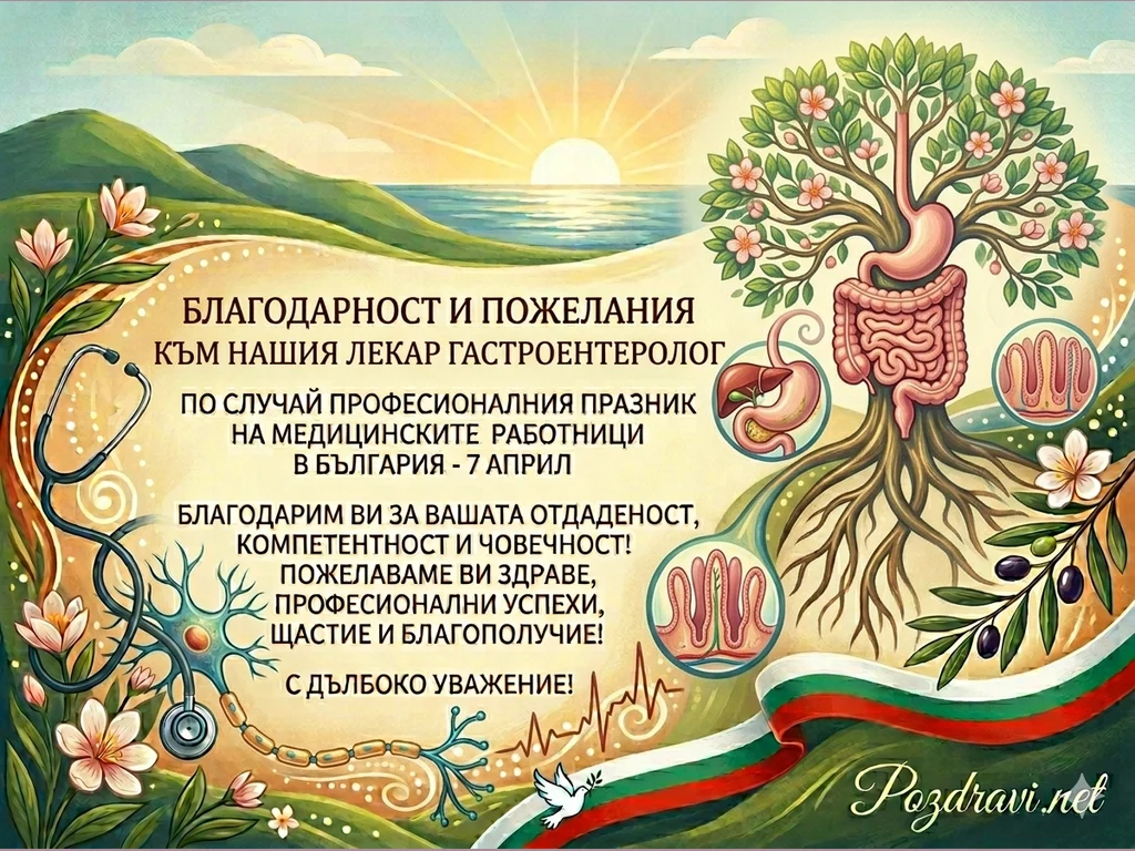 Тази красива поздравителна картичка е посветена на професионалния празник на медицинските работници в България – 7 април, и е специално адресирана към лекарите гастроентеролози.