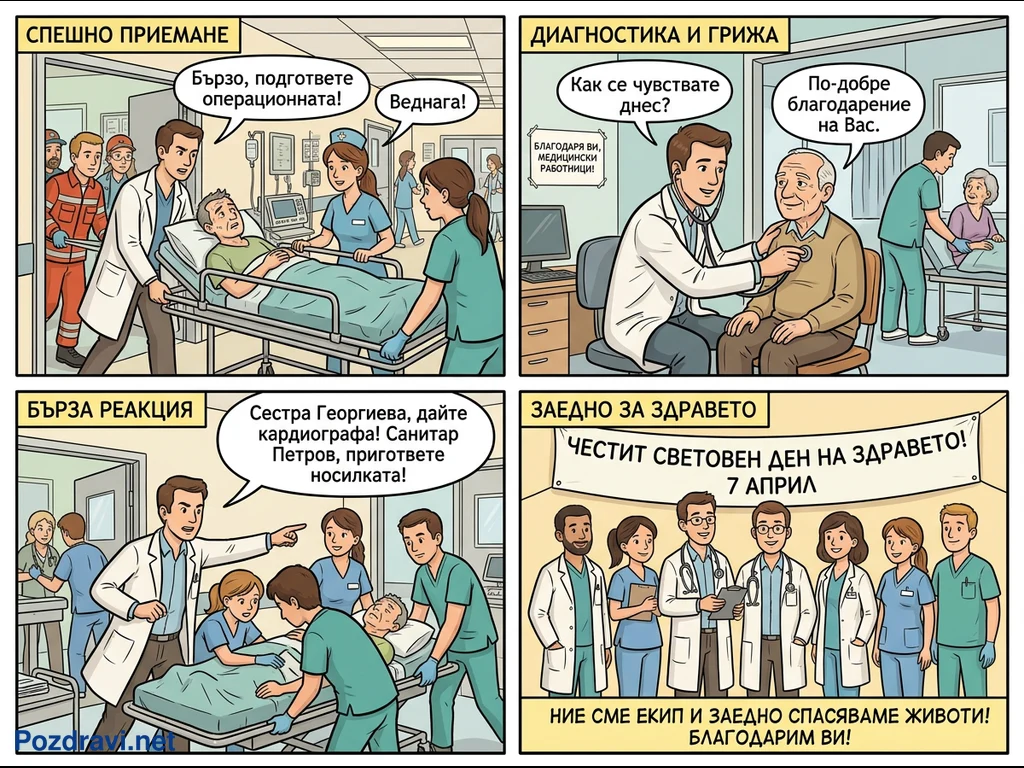 Този комикс от четири панела илюстрира различни аспекти от работата на медицинските специалисти. Първите три панела показват спешни приеми, бърза реакция и грижовна диагностика, където лекари и сестри действат координирано, за да спасяват животи и да осигуряват грижи. Пациентите изразяват благодарност, а медицинският персонал демонстрира професионализъм и отдаденост. Последният панел е посветен на Световния ден на здравето, 7 април, и представя екип от усмихнати здравни работници, които подчертават своята мисия да спасяват животи заедно.