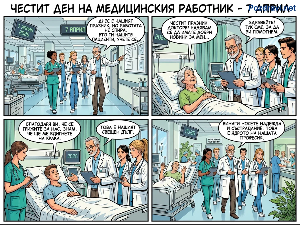 Комиксът от четири панела показва ежедневието в болница на 7 април – Деня на медицинския работник. Старши лекар води екип от по-млади колеги през болнични отделения, подчертавайки непрекъснатата грижа за пациентите и важността на обучението. Те разговарят с различни пациенти, които изразяват благодарност за грижите, докато лекарите им вдъхват надежда и увереност. Наративът акцентира върху основните ценности на медицинската професия: дълг, състрадание и стремеж към изцеление, дори и на празничен ден.