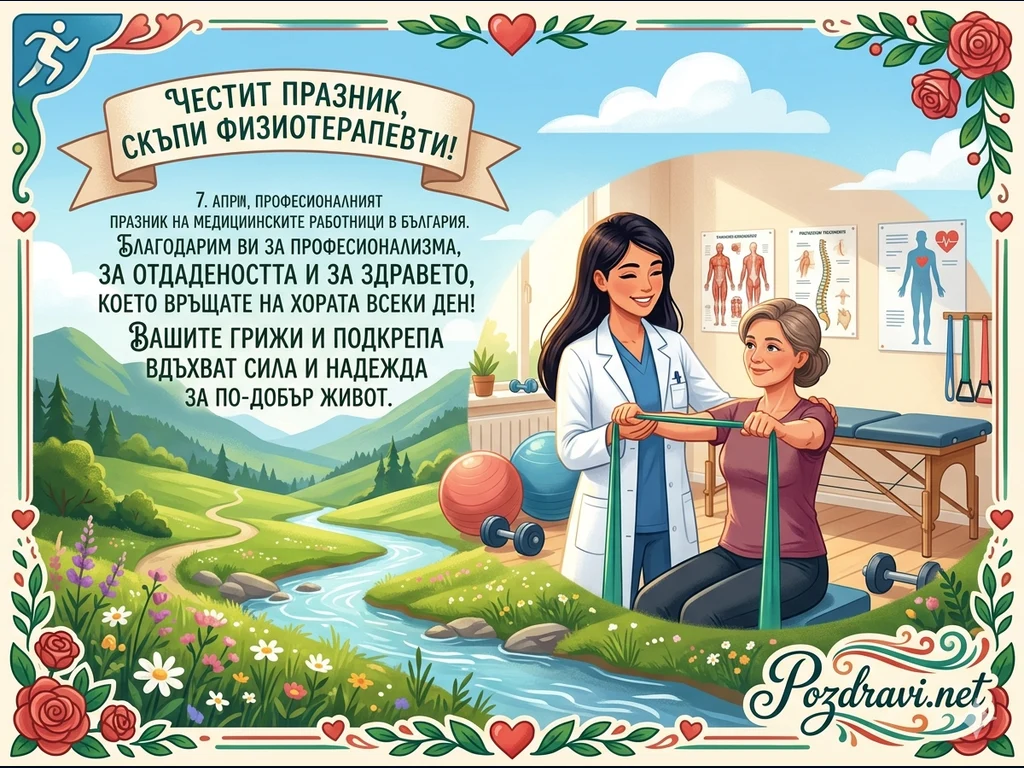 В лявата част е изписано празнично послание за 7 април – професионалния празник на медицинските работници в България, с топли думи към физиотерапевтите.