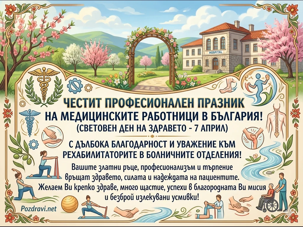 В центъра е поставено поздравление за професионалния празник на медицинските работници в България на 7 април, като специален акцент е поставен върху рехабилитаторите в болничните отделения.
