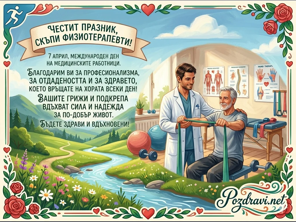 В лявата част е разположено поздравително послание за физиотерапевтите по повод празника на медицинските работници, а в дясната е показан терапевт, който помага на възрастен пациент по време на упражнение с ластик.