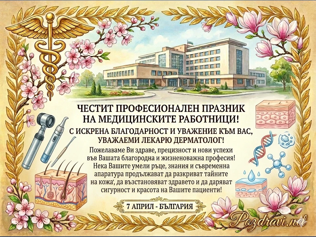 Поздравителна картичка, посветена на дерматолозите по случай 7 април, създадена в изискан, класически стил с пейзажно разположение, съчетаващ медицинска символика, специализирани илюстрации и флорална свежест.
