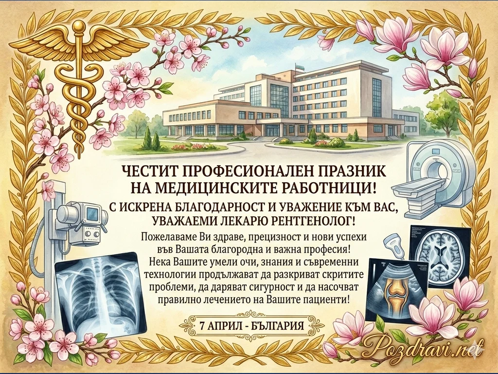 Тематичната поздравителна картичка, посветена на лекарите-рентгенолози по случай 7 април, създадена в изискан, класически стил с пейзажно разположение, съчетаващ медицинска символика, модерни технологии и флорална свежест.