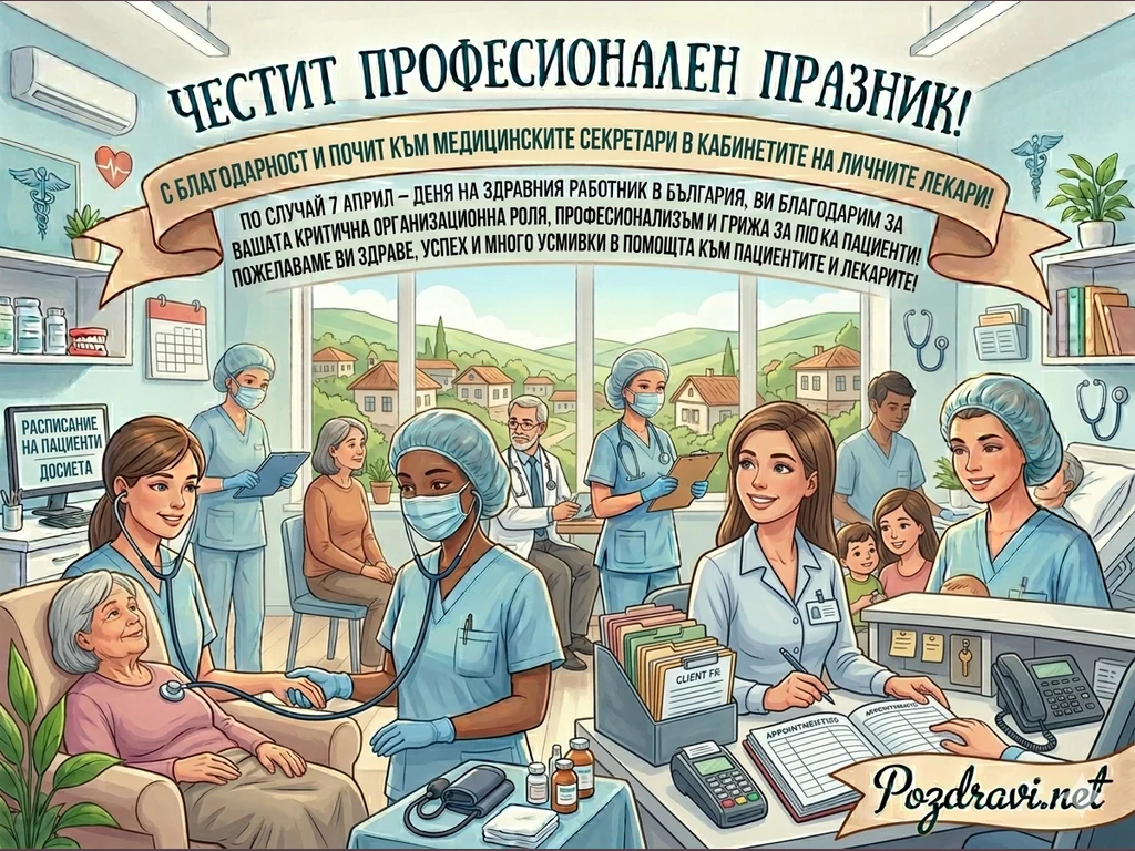 Текст и послание: В горната част, върху декоративен свитък, е изписано на чист български език: 'Честит професионален празник! С благодарност и почит към медицинските секретари в кабинетите на личните лекари!'. Текстът продължава с признание за тяхната критична организационна роля и пожелания за здраве и усмивки по случай 7 април.