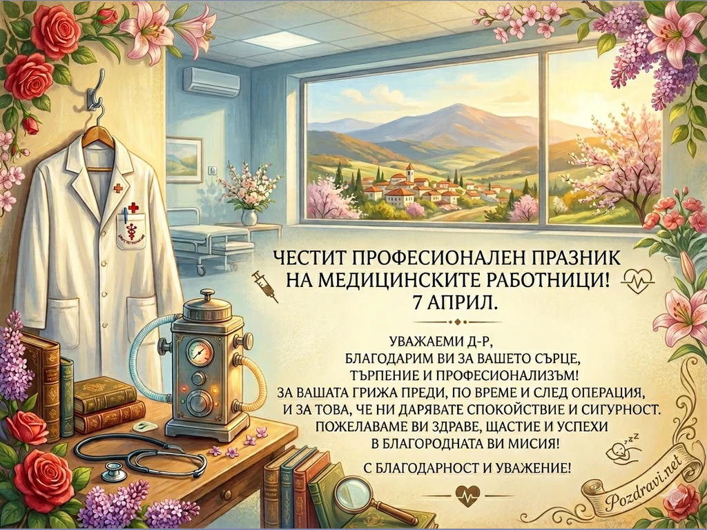 Красива поздравителна картичка създадена специално за Деня на здравния работник – 7 април, с фокус върху благородната професия на анестезиолога. Композицията съчетава професионална символика с уютна, пролетна атмосфера.