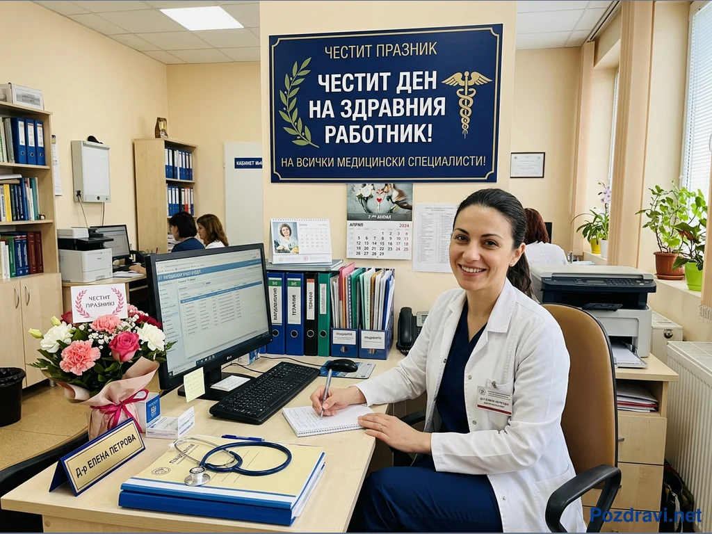 Усмихната лекарка, Д-р Елена Петрова, е заснета в своя кабинет, седнала зад бюрото си и пишеща в тетрадка. На бюрото ѝ има букет цветя, стетоскоп, папки и компютърен монитор, показващ медицинска информация. Зад нея се вижда голям син надпис 'ЧЕСТИТ ДЕН НА ЗДРАВНИЯ РАБОТНИК!', както и рафтове с документи и други колеги, работещи на заден план. Обстановката е на професионален и подреден медицински кабинет, създаващ приветлива атмосфера.
