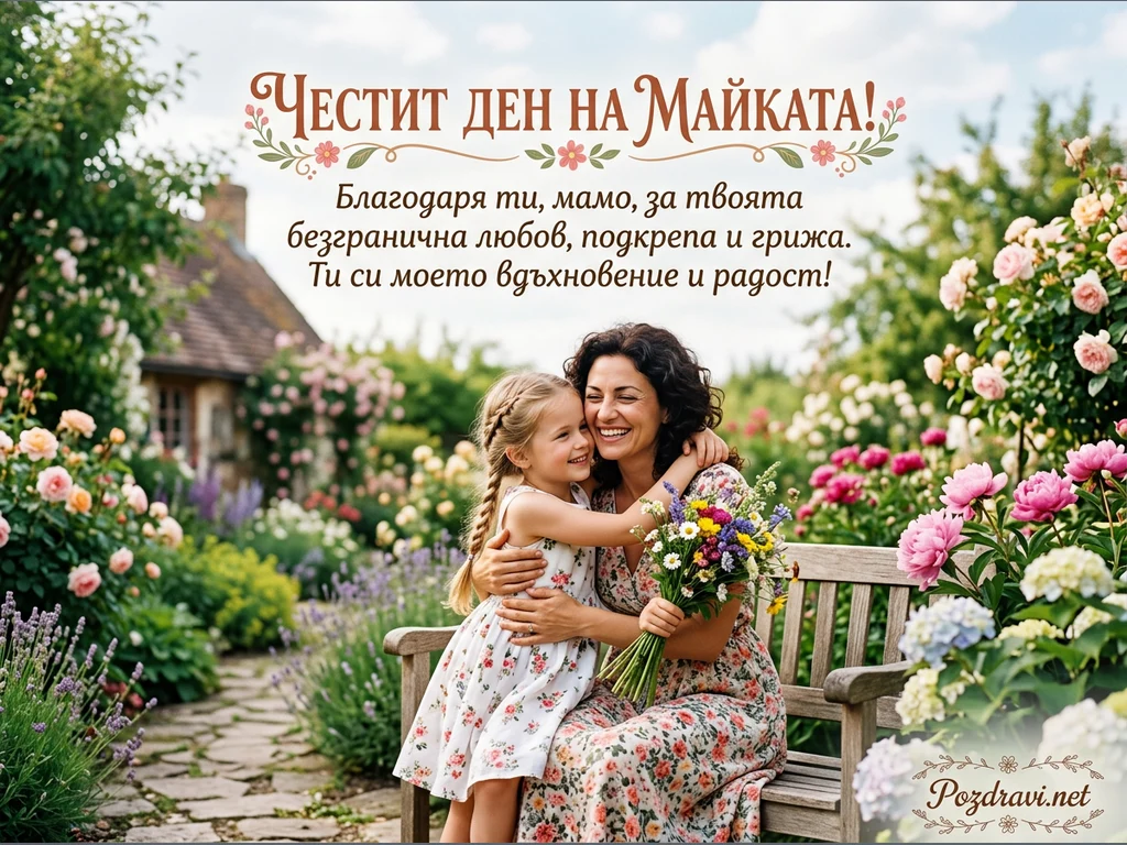 На картичката е изобразена усмихната майка, прегърнала нежно своята дъщеря, докато седят на дървена пейка. Майката държи букет от пъстри полски цветя, а двете са облечени в летни рокли с флорални мотиви. Зад тях се простира разкошна градина, изпълнена с цъфтящи рози, божури и лавандула, водеща към уютна къща с каменна пътека. В горната част на картичката е изписано 'Честит ден на Майката!' и послание за благодарност, любов и вдъхновение.
