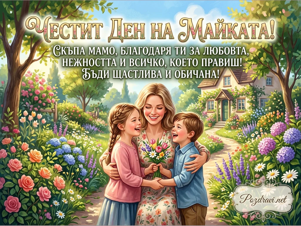 На картичката е изобразена щастлива майка, прегърнала своите две усмихнати деца – момиченце и момченце, които ѝ подаряват букет от пролетни цветя. Сцената е на фона на живописна градина, изпълнена с цъфтящи рози, лалета, хортензии и други цветя, както и зелени дървета и уютна къща. Над тях е изписан надпис 'Честит Ден на Майката!', придружен от сърдечно послание: 'Скъпа мамо, благодаря ти за любовта, нежността и всичко, което правиш! Бъди щастлива и обичана!'. Цялостната атмосфера е на топлота, обич и пролетно настроение.