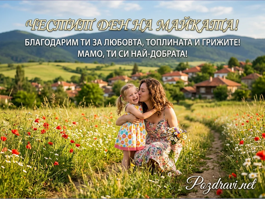 Млада майка и нейната малка дъщеря са заснети в сърдечна прегръдка и целувка насред живописна поляна с червени макове и бели маргаритки. Майката, облечена в цветна рокля, е клекнала и държи букет от полски цветя, докато дъщеря ѝ, с две опашчици и пъстра рокля, се смее щастливо. На заден план се разкрива красив пейзаж с традиционно българско село, сгушено сред зелени хълмове и планини под ясно синьо небе. Над сцената е изписано 'ЧЕСТИТ ДЕН НА МАЙКАТА! БЛАГОДАРИМ ТИ ЗА ЛЮБОВТА, ТОПЛИНАТА И ГРИЖИТЕ! МАМО, ТИ СИ НАЙ-ДОБРАТА!'.