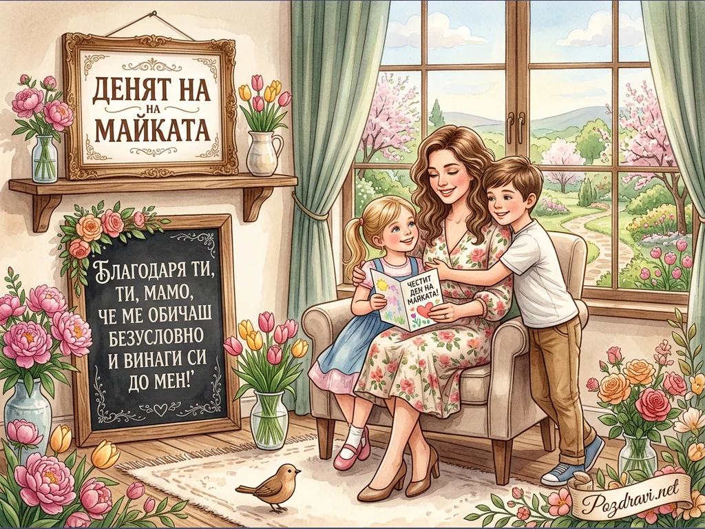 Една усмихната майка седи удобно в кресло, прегърната от своите две щастливи деца – момиченце и момченце. Момиченцето държи отворена картичка с надпис 'ЧЕСТИТ ДЕН НА МАЙКАТА!', докато момченцето нежно я е прегърнало. Зад тях се вижда прозорец с красива пролетна градина, изпълнена с цъфтящи дървета и цветя. В стаята има и други елементи като рамкиран надпис 'ДЕНЯТ НА МАЙКАТА' и черна дъска с послание 'БЛАГОДАРЯ ТИ, ТИ, МАМО, ЧЕ МЕ ОБИЧАШ БЕЗУСЛОВНО И ВИНАГИ СИ ДО МЕН!'.