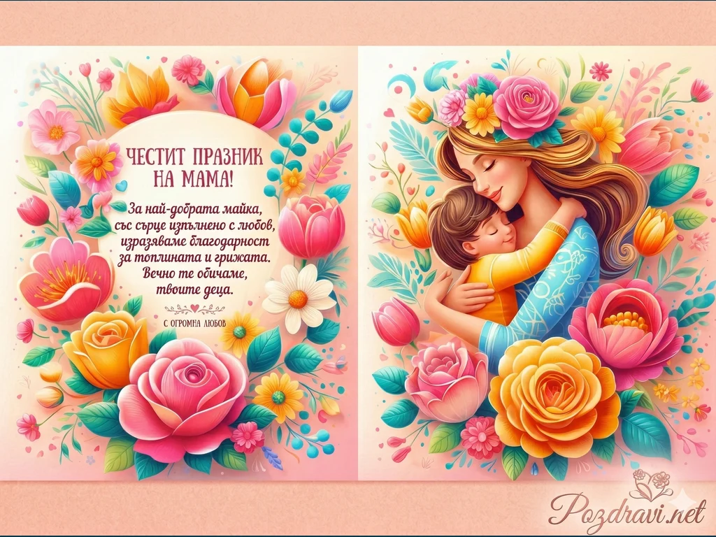 Изображението представлява нежна дигитална илюстрация, разделена на две основни части, която прелива в топли розови и пастелни тонове. В лявата страна е разположен красив флорален венец от рози, маргаритки и лалета, обгръщащ емоционално послание на български език за празника на майката. Дясната част показва трогателна сцена, в която майка с дълга кестенява коса и синя флорална рокля е прегърнала нежно своето дете. Цялата композиция е изпълнена с пролетна свежест и детайлни растителни орнаменти, които създават усещане за уют, признателност и дълбока семейна обич.