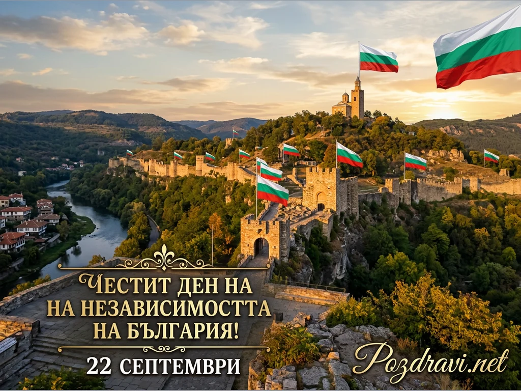 Панорамна гледка към крепостта Царевец във Велико Търново по залез слънце, окъпана в мека светлина. Множество български знамена се веят гордо по крепостните стени и кули, включително над Патриаршеската катедрала. Река Янтра лъкатуши в подножието на хълма, а по бреговете ѝ са разположени традиционни къщи. В долната част на картичката е изписано 'Честит ден на независимостта на България! 22 септември', което подчертава празничния повод.