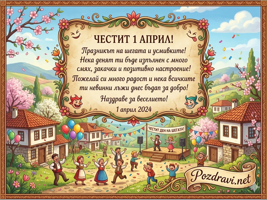 Картичката представя жизнерадостна и празнична сцена в живописно българско село през пролетта. На преден план е разположена голяма, богато орнаментирана рамка в ретро стил, напомняща на старинна грамота. В нея е изписано сърдечно пожелание за 1-ви април, призоваващо към смях, закачки и позитивно настроение. Около текста са добавени малки забавни илюстрации на шутовски маски.