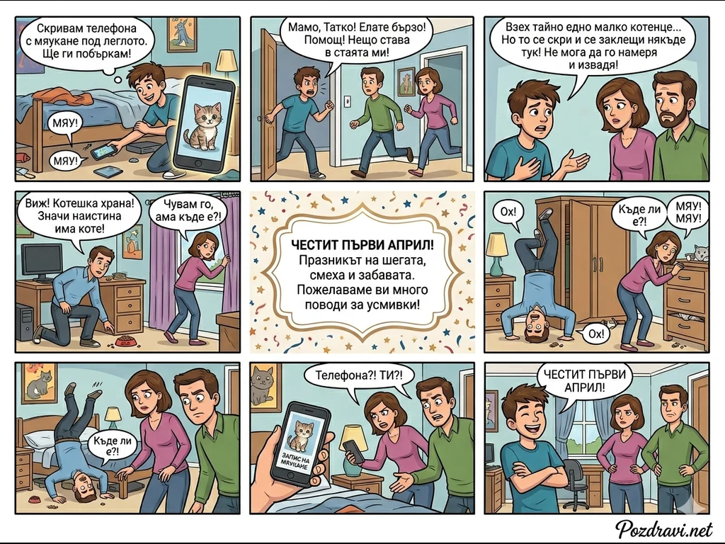 Развръзката настъпва, когато майката открива телефона с приложението за мяукане. Накрая, тийнейджърът с широка усмивка поздравява всички: 'Честит Първи април!'.