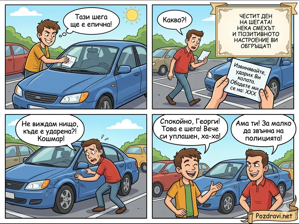 Тази празнична картичка представлява забавен комикс в четири панела, разгърнат в пейзажен формат. Сюжетът проследява класическа първоаприлска шега с 'ударена кола'. В първия кадър усмихнат младеж оставя бележка под чистачката на син автомобил, мислейки си за предстоящата реакция. Вторият и третият панел улавят паниката на собственика, който чете съобщението и трескаво оглежда колата за несъществуващи повреди. Финалът е изпълнен със смях, след като истината е разкрита, точно преди да бъде потърсена помощ от полицията.