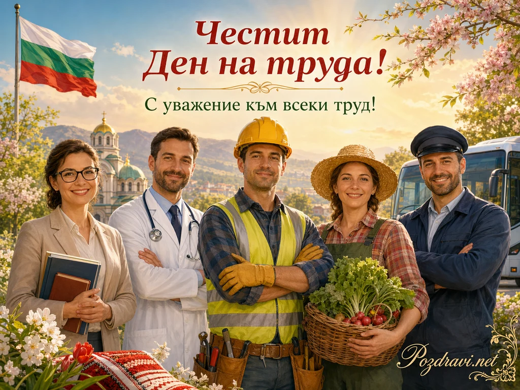 Под топло пролетно небе се развява българското знаме, а в центъра стои голям надпис 'Честит Ден на труда!' с подзаглавие 'С уважение към всеки труд!'. На преден план са подредени петима усмихнати души, които символизират различни професии и труда в обществото. Вляво стои елегантна жена с очила и книги в ръце, до нея има лекар с бяла престилка и стетоскоп. В средата е строителен работник с жълта каска и светлоотразителна жилетка, а до него е жена земеделец със сламена шапка и кошница, пълна със свежи зеленчуци. Най-вдясно е мъж в тъмносиня униформа, напомнящ шофьор на автобус, а зад него се вижда самото превозно средство. На заден план личат храм, планини, нежна слънчева светлина и цъфнали клони, които придават празнично, спокойно и благодарствено настроение.