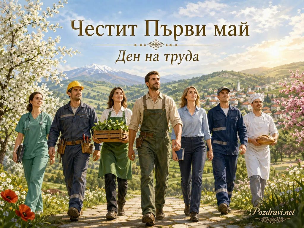 Под цъфнали дървета по каменна пътека вървят седем души от различни професии, обединени в празнична пролетна сцена. Вляво се вижда медицинска работничка, а до нея крачи строител с жълта каска и колан с инструменти. В центъра са жена с щайга зелени растения и мъж с работен гащеризон, които създават усещане за труд, земя и грижа. До тях вървят елегантно облечена жена с тетрадка, работник в синя униформа и пекар в бяло облекло, който носи хляб. На заден план се разкриват зелени хълмове, малко селище и висока планина под синьо небе с меки облаци и топла слънчева светлина. В горната част с големи букви е изписано 'Честит Първи май', а под него стои надписът 'Ден на труда'. Цялата композиция съчетава пролетна красота, усещане за общност и уважение към хората на труда.
