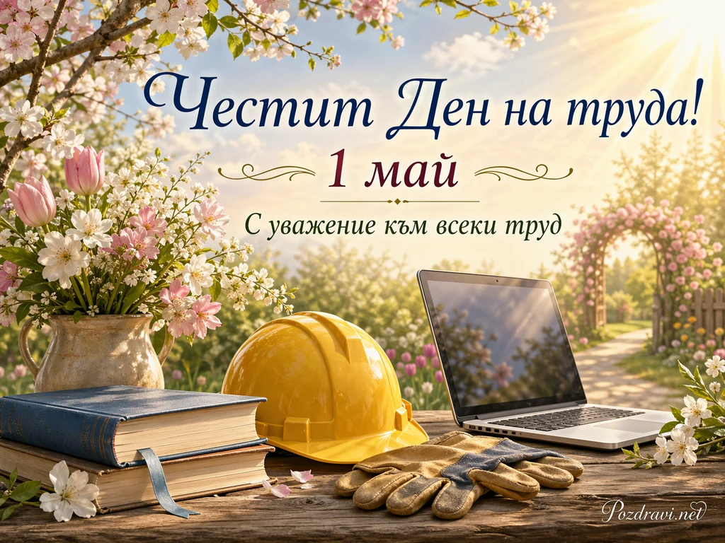 Пролетна сцена с цъфнали клонки и мека слънчева светлина създава топла и празнична атмосфера. В центъра стои надписът 'Честит Ден на труда! 1 май', изписан с елегантен шрифт. Под него се вижда посланието 'С уважение към всеки труд', което подчертава темата за признателност и почит към работата. На дървена маса отпред са подредени жълта предпазна каска, работни ръкавици, лаптоп и няколко книги. Вляво има голяма ваза с нежни пролетни цветя в бяло и розово, които допълват свежото настроение. На заден план се откроява градинска алея с цветна арка, обградена от зеленина и разцъфнали дървета. Съчетава се усещане за труд, знание, професионализъм и пролетно обновление.