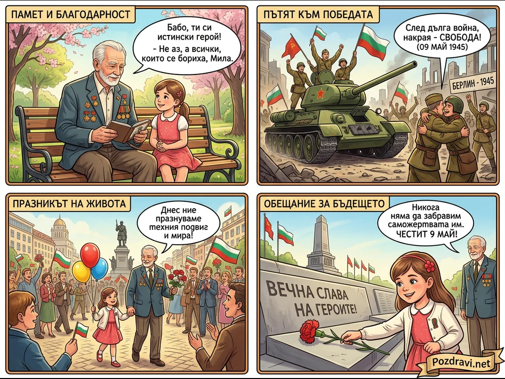 Комиксът в четири панела проследява темата за Деня на победата на 9 май. Той показва ветеран, който споделя спомени с малко момиче, сцени от освобождението на Берлин през 1945 г. и празнично шествие. В последния панел момичето полага цвете на паметник с надпис 'Вечна слава на героите!', символизирайки обещанието на бъдещите поколения да помнят. Цялостното послание е за благодарност, мир и почит към саможертвата на героите.