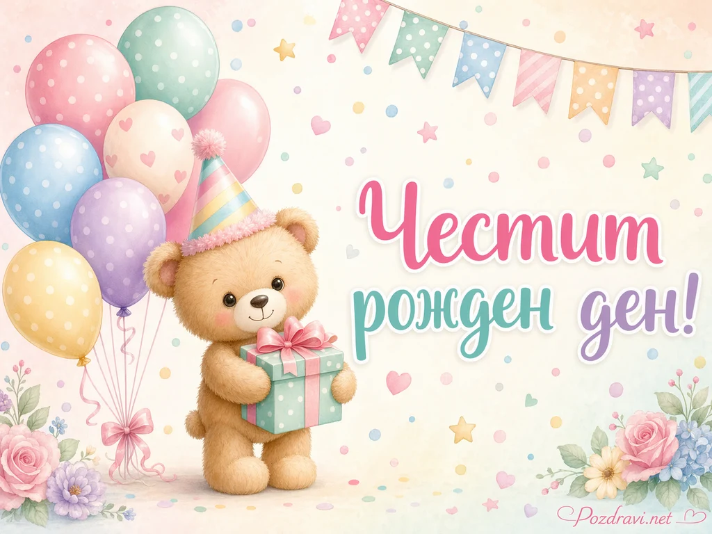 Весела детска картичка показва плюшено мече с парти шапка, което държи подарък с розова панделка. Около мечето има много пастелни балони в розово, синьо, жълто, лилаво и зелено, завързани с нежни панделки. В горната част е опънат цветен парти гирлянд с различни шарки, а фонът е изпълнен с конфети, сърца и малки звездички. Надписът на картичката гласи дословно: 'Честит рожден ден!'. Буквите са големи, меки и празнични, оцветени в розово, тюркоазено и лилаво. В долните ъгли има нежни цветя, които допълват сладкото и приказно настроение. Цялата сцена носи усещане за мил детски рожден ден, много радост и нежна празнична атмосфера.