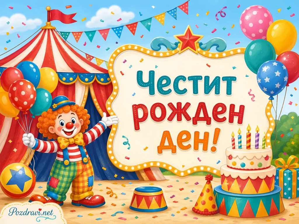 Пъстра циркова сцена е украсена с балони, гирлянди, конфети и голяма шатра с червено-бели ивици. Усмихнат клоун с оранжева къдрава коса държи балони и сочи към голяма светеща табела в центъра. На табелата е изписано дословно: 'Честит рожден ден!'. Вдясно има празнична торта на два етажа със запалени свещички и цветна циркова украса. Около нея се виждат подарък, парти шапка и малък цирков барабан. Цялата сцена носи весело настроение с ярки цветове, детски празничен стил и много детайли за рожден ден.