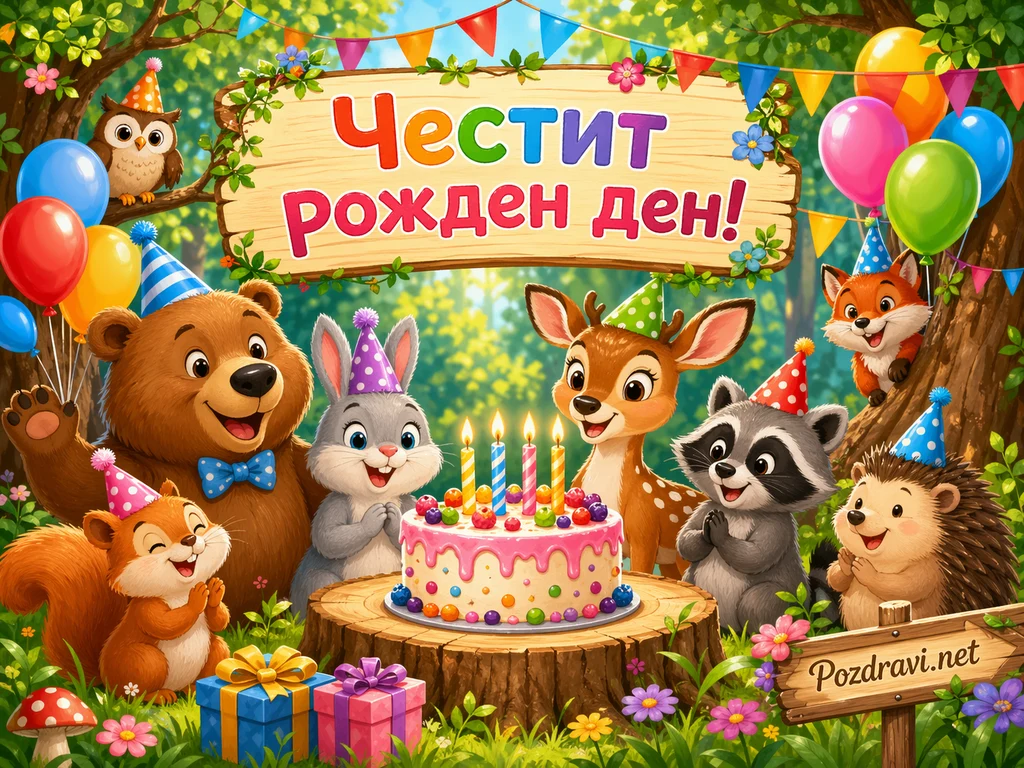В горска поляна е подредено весело рождено тържество с голяма торта, украсена с цветни бонбони, плодове и запалени свещички. Около тортата се радват усмихнати животни с празнични шапки, сред които мечка, зайче, еленче, миеща мечка, таралеж, катеричка, лисиче и бухал. Над тях има дървена табела с ярък надпис 'Честит рожден ден!'. Пространството е изпълнено с балони, гирлянди, знаменца, цветя и подаръци, които създават игрива и детска празнична атмосфера. Слънчевата гора на заден план придава топлина, свежест и усещане за приказен рожден ден сред природата. Всички животни изглеждат щастливи и развълнувани, сякаш очакват моментът със свещичките да започне.