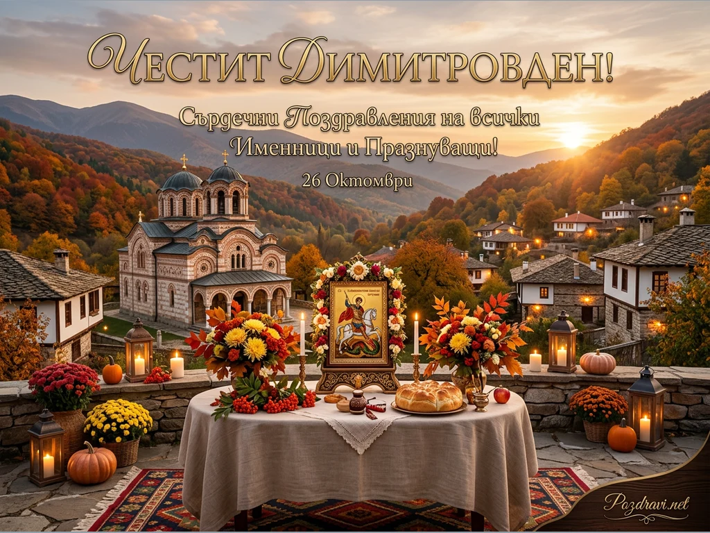На преден план е аранжирана празнична маса с бяла покривка, върху която са поставени икона, свещи, есенни цветя, питка и червени плодове. Зад масата се разкрива живописна планинска долина с традиционни къщи, осветени от залязващото слънце, и голяма църква с куполи. Есенната природа е представена с дървета в топли оранжеви, червени и жълти нюанси, а небето е обагрено в меки цветове на залез. В горната част на картината е изписан надпис 'Честит Димитровден! Сърдечни Поздравления на всички Именници и Празнуващи! 26 Октомври', който указва повода за тържеството.