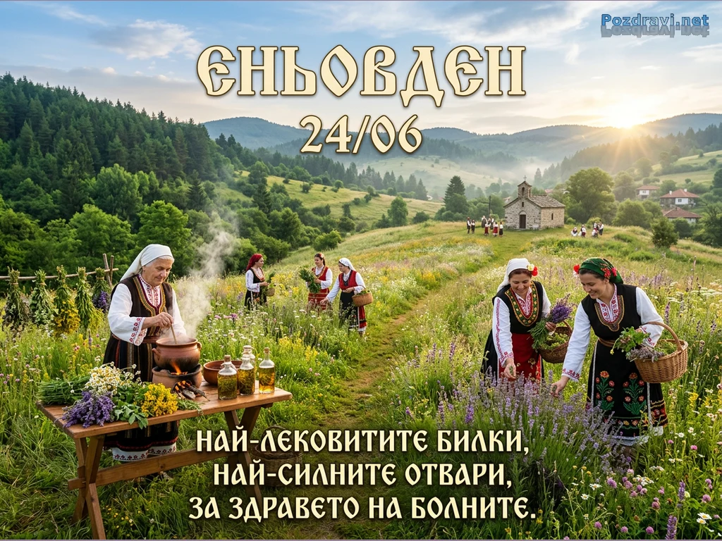 Слънчев планински пейзаж разкрива български традиции по Еньовден. Жени в народни носии събират билки из цъфтящи ливади, докато възрастна жена приготвя отвари на открито. На заден план се вижда малка каменна църква и селски къщи, озарени от топлата светлина на изгрева. Сцената е изпълнена с духа на народната медицина и празника на билките, отбелязван на 24 юни.