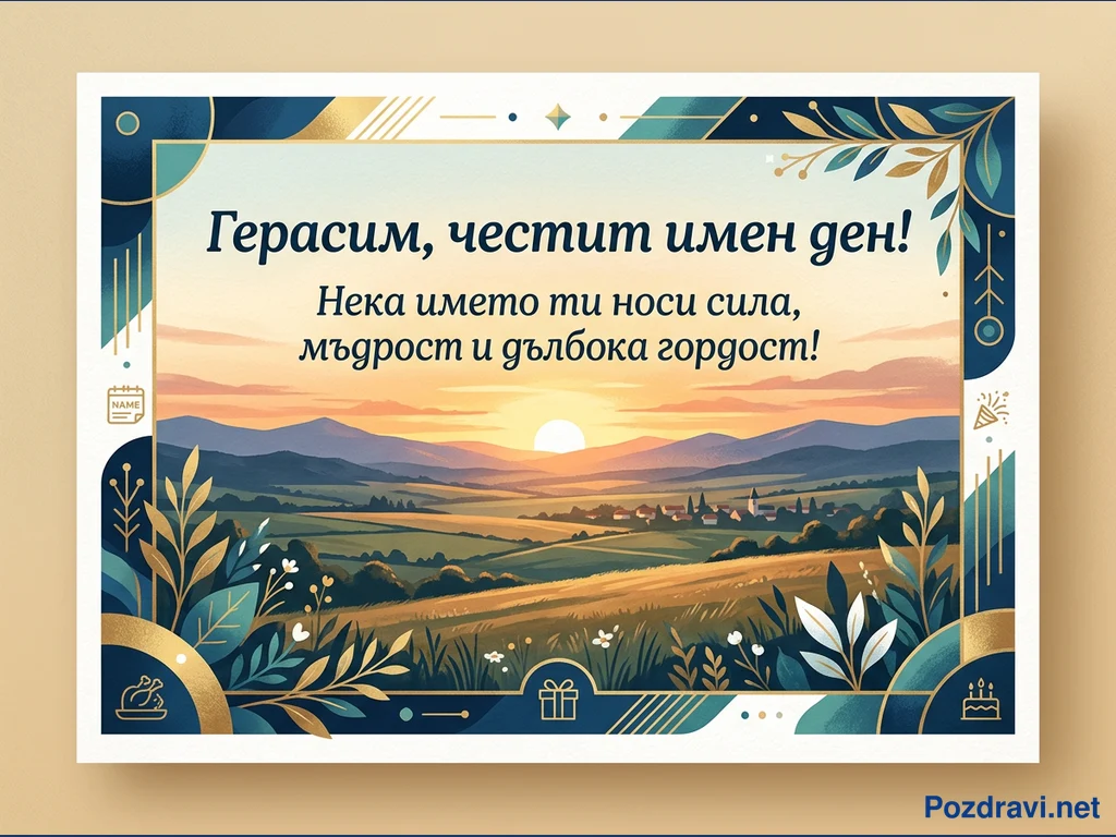 Тази поздравителна картичка за имен ден е с елегантен дизайн, включващ централен пейзаж със залез или изгрев над хълмиста местност и малко селце. Рамката е богато декорирана в тъмносини, златни и тюркоазени тонове, с флорални елементи и геометрични мотиви, придаващи изискан вид. Върху фона на небето с оранжеви и розови нюанси е изписан поздравът 'Герасим, честит имен ден! Нека името ти носи сила, мъдрост и дълбока гордост!'. В ъглите и по долния борд са разположени стилизирани икони, символизиращи празник – като календар, печено пиле, подарък и торта. Цялостната композиция създава усещане за спокойствие и тържественост.