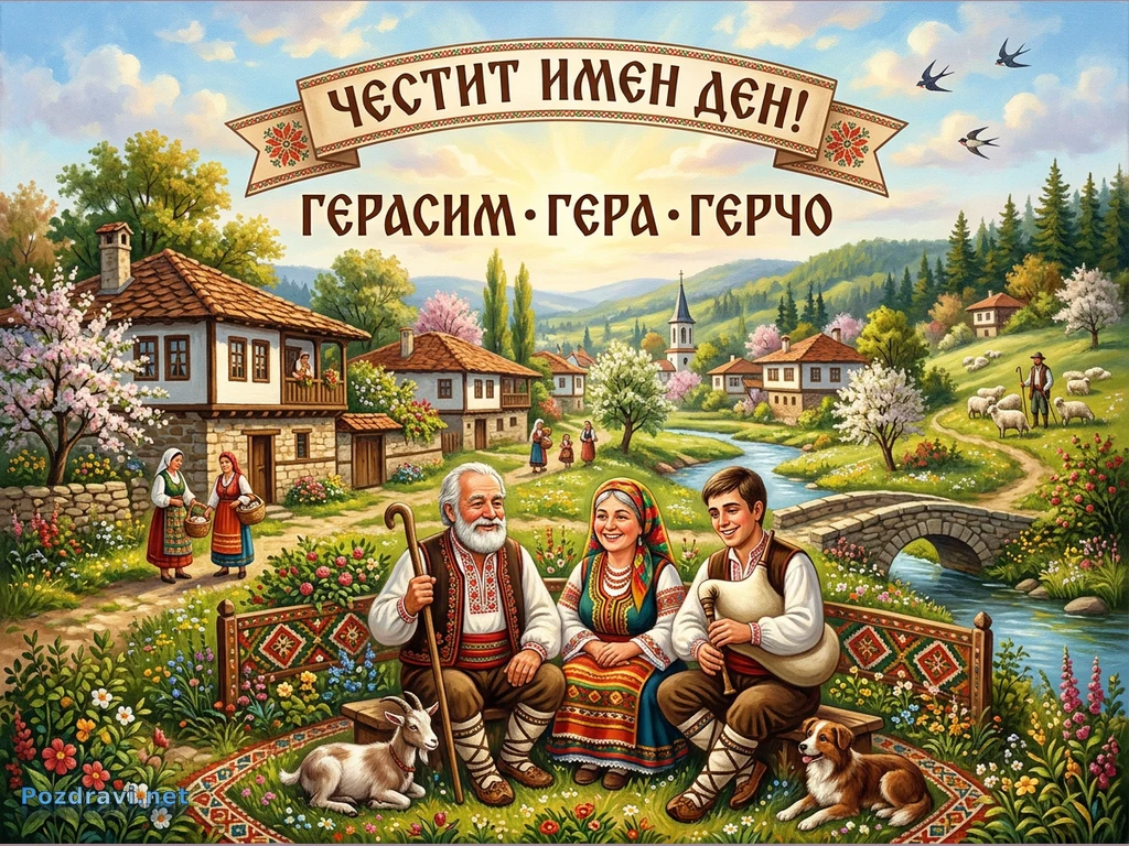 Тази живописна картичка изобразява идилична българска селска сцена, вероятно през пролетта, изпълнена с живот и традиция. В преден план, усмихнати възрастна двойка и млад мъж, облечени в традиционни носии, са седнали на пейка с фолклорни мотиви, като младият мъж свири на гайда, а до тях почиват козле и куче. Зад тях се виждат каменни къщи с червени покриви, цъфтящи дървета и река, пресичана от каменен мост, водеща към църква на хоризонта. На заден план овчар пасе стадо овце по хълмовете, а в небето летят лястовици, допълвайки спокойната атмосфера. Надписът 'ЧЕСТИТ ИМЕН ДЕН! ГЕРАСИМ • ГЕРА • ГЕРЧО' украсява горната част, превръщайки сцената в празничен поздрав.