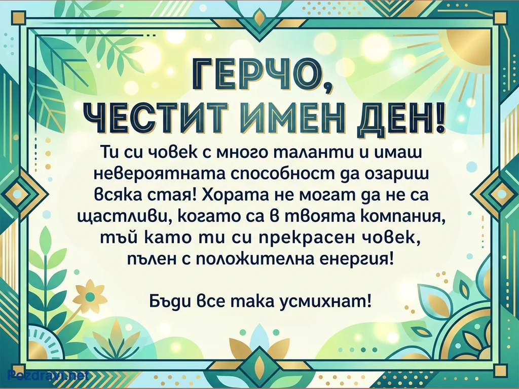Тази поздравителна картичка е с празничен дизайн за имен ден. Тя е оформена с елегантна рамка в нюанси на зелено, тюркоаз и златисто, украсена с геометрични мотиви и стилизирани листа. Фонът е светъл и сияен, с меки преливащи цветове и ефект на боке, създаващ топла атмосфера. В центъра е изписано 'ГЕРЧО, ЧЕСТИТ ИМЕН ДЕН!', придружено от сърдечно пожелание, възхваляващо позитивните качества на получателя и приканващо го да бъде винаги усмихнат.