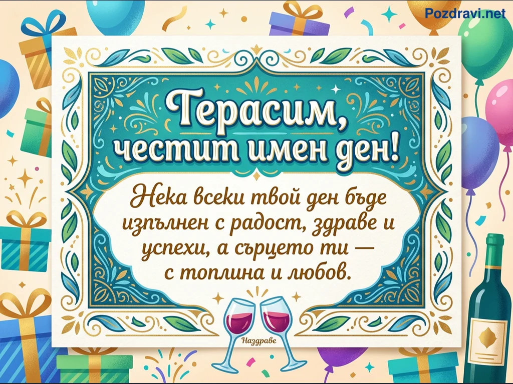 Празнична картичка за имен ден, адресирана до Терасим, е централен елемент на изображението. Тя е богато орнаментирана с флорални и вихрени мотиви в тюркоазено, златно и кремаво, съдържаща пожелание за радост, здраве, успехи, топлина и любов. Фонът е изпълнен с цветни балони, опаковани подаръци и конфети, създаващи весела и тържествена атмосфера. В долната част на картичката са изобразени две наздравици с чаши вино и надпис 'Наздраве', а отдясно се вижда бутилка вино.