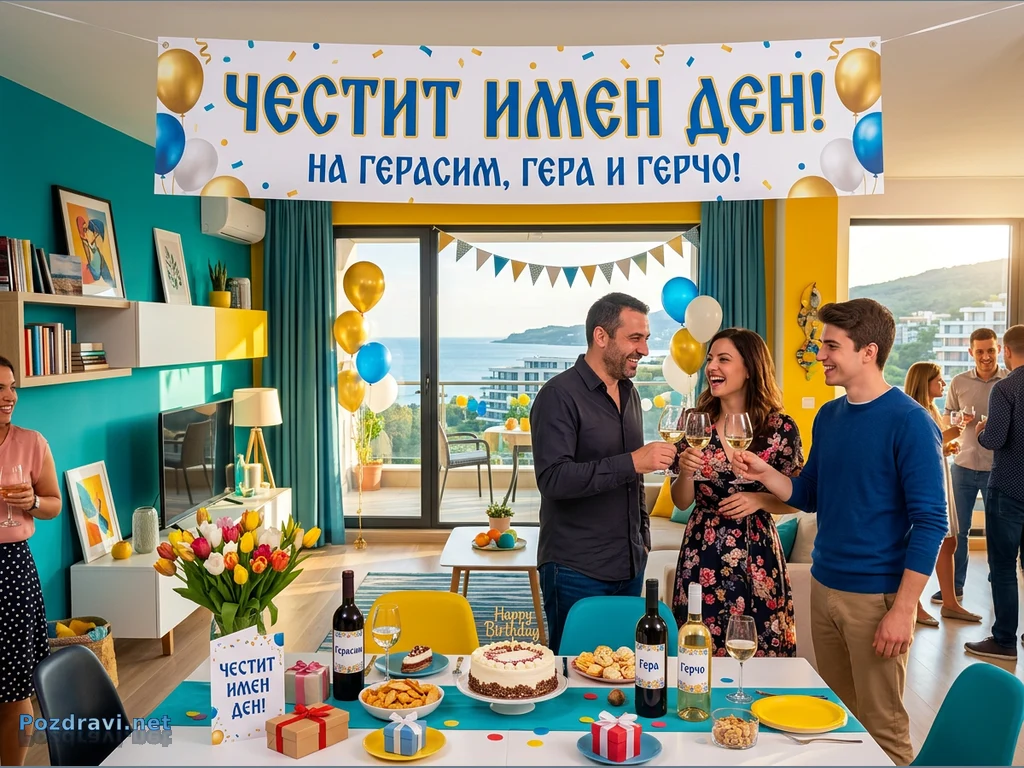 В просторен апартамент с морска панорама се провежда весело празненство за имен ден. Гостите се наслаждават на напитки и разговори, докато на преден план е отрупана маса с торта, подаръци, вино и букет лалета. Декорацията включва голям банер 'ЧЕСТИТ ИМЕН ДЕН! НА ГЕРАСИМ, ГЕРА И ГЕРЧО!', балони и цветни гирлянди, създаващи празнична атмосфера.