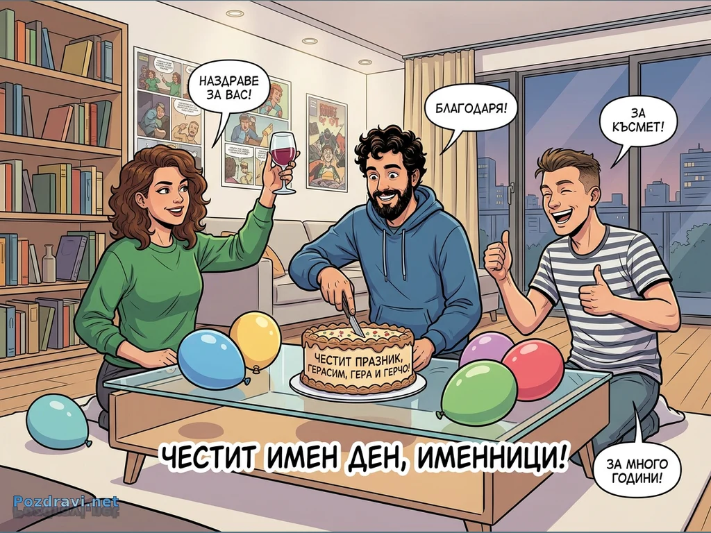Трима приятели празнуват имен ден в уютна всекидневна, изпълнена с радост и балони. Жена вдига тост с чаша вино, усмихвайки се, докато мъж с брада реже празнична торта, надписана с 'ЧЕСТИТ ПРАЗНИК, ГЕРАСИМ, ГЕРА И ГЕРЧО!'. Третият приятел, с широка усмивка, показва палци нагоре в знак на одобрение и щастие. Общото настроение е весело и празнично, с пожелания 'Наздраве за вас!', 'Благодаря!', 'За късмет!' и 'За много години!'. Надписът в долната част на картичката гласи 'ЧЕСТИТ ИМЕН ДЕН, ИМЕННИЦИ!'.