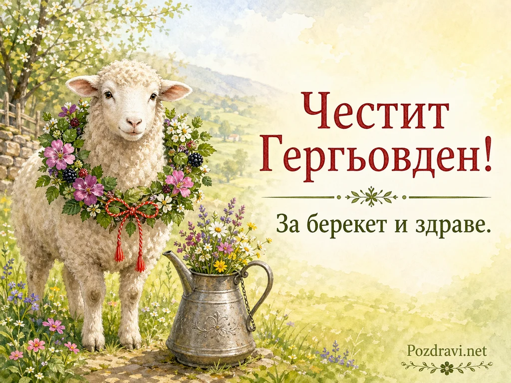 Меко бяло агънце стои на преден план сред пролетна поляна, а около врата му има пищен венец от диви цветя и зеленина, завързан с червена панделка. Отляво се вижда разлистено дърво с бели цветчета и дървена ограда, които подсказват селски двор и спокойствие. На земята до агънцето е поставена метална лейка с релефни орнаменти, от която излизат свежи полски цветя в жълто, лилаво и бяло. Фонът прелива към далечни хълмове и планини, нарисувани меко и ефирно като акварел. Светлината е топла и златиста, а цветовете са нежни, пастелни и пролетни. В дясната част с големи букви е изписано 'Честит Гергьовден!', а отдолу 'За берекет и здраве.'. Цялата сцена носи усещане за чистота, плодородие и празничен пролетен ден.