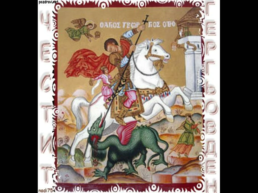 Ключови фрази: Гергьовден именден мъж жена пожелания картички празник манастир икона Светец дракон ламя копие Георги Габриел Гаврил Гиньо Ганчо Генчо Генади Гюро Гошо