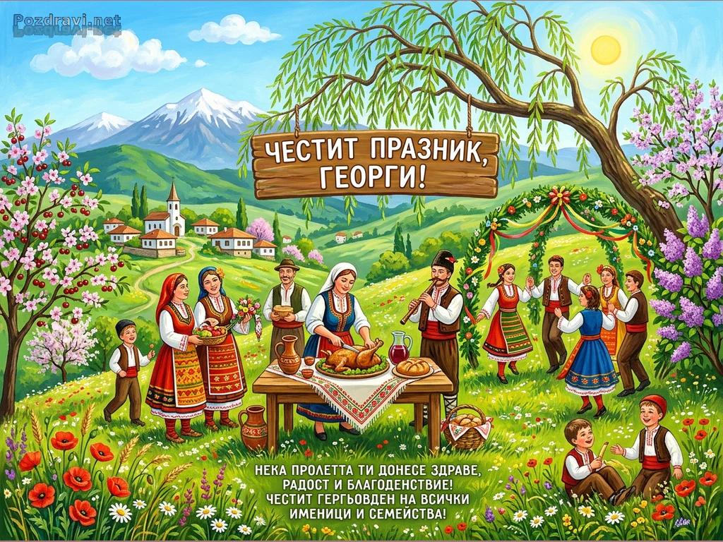 Картината изобразява живописна българска пролетна сцена, изпълнена с празненства и традиция. Хора в народни носии са събрани на зелена поляна, на фона на планински пейзаж с цъфтящи дървета и китно село. В центъра семейство е около трапеза с печено агне, докато други танцуват хоро под арка от цветя и панделки. Деца играят сред макове и маргаритки, а надпис 'ЧЕСТИТ ПРАЗНИК, ГЕОРГИ!' виси от върба, допълвайки празничната атмосфера на Гергьовден.