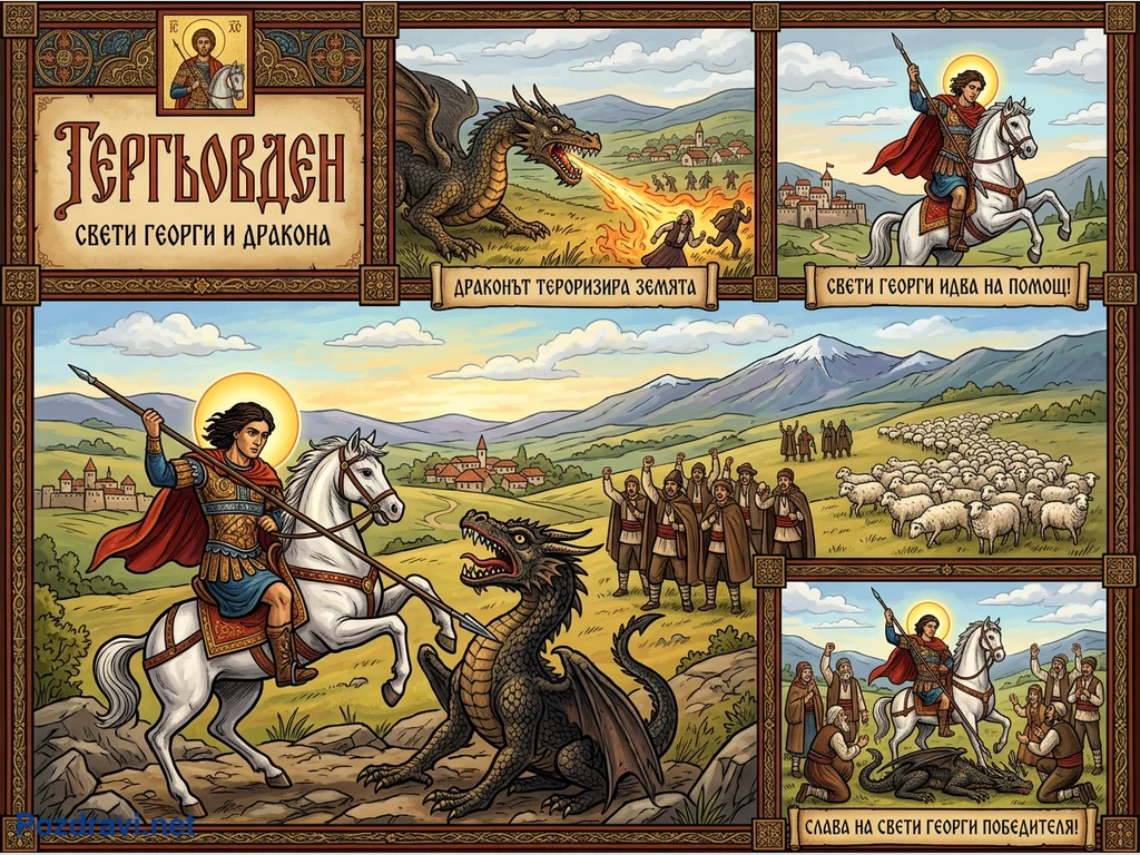 Тази илюстрация разказва легендата за Свети Георги и дракона, свързана с празника Гергьовден, представена в стил на комикс. Тя показва как драконът тероризира земята, а Свети Георги пристига на помощ, яхнал бял кон. В централната сцена светецът пронизва чудовището с копие, докато селяни и стадо овце наблюдават от фона на живописен пейзаж. Финалният панел изобразява ликуващите хора, които отдават почит на победителя Свети Георги. Цялата композиция е изпълнена с ярки цветове и традиционни орнаменти.