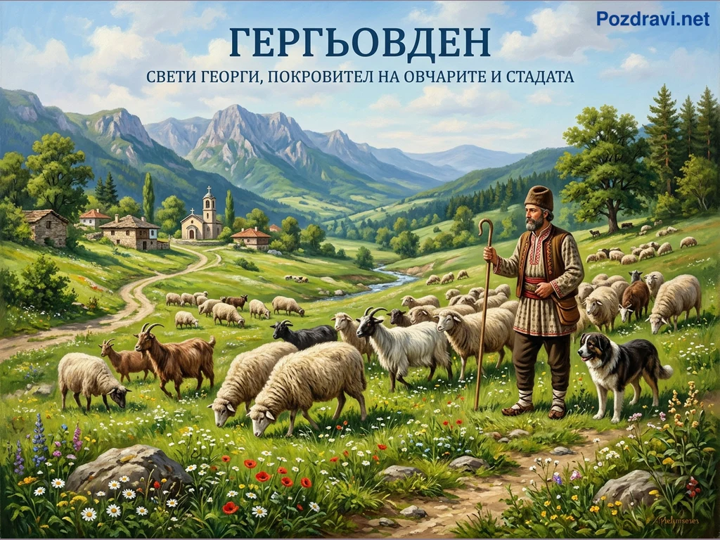 Ключови фрази: Гергьовден, български овчар, планински пейзаж, стадо овце, традиционен празник