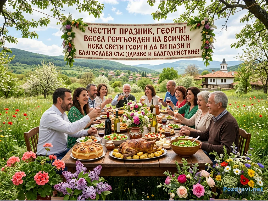 Ключови фрази: Гергьовден празник, традиционна българска трапеза, семейно събиране на открито, пролетен пейзаж България, честит Гергьовден