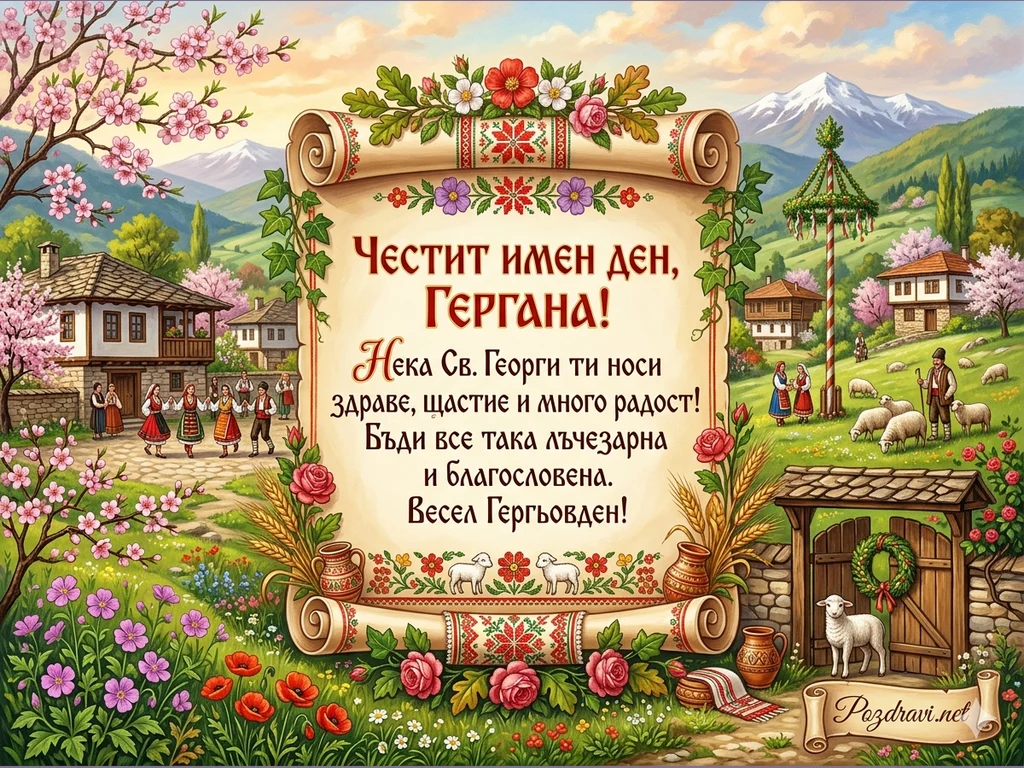 Тази живописна поздравителна картичка за Гергьовден, създадена специално за Гергана, пренася в атмосферата на красиво българско планинско село през пролетта. Централно място заема богато орнаментиран пергаментен свитък, рамкиран с български народни мотиви, нежни розови рози, зелени клонки и класове узряла пшеница. На него с елегантен български шрифт е изписано пожеланието: 'ЧЕСТИТ ИМЕН ДЕН, ГЕРГАНА! Нека Св. Георги ти носи здраве, щастие и много радост! Бъди все така лъчезарна и благословена. Весел Гергьовден!'.